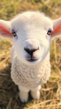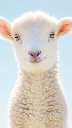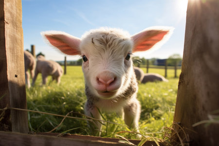 A charming lamb in a sunny field. Soft, fluffy wool and peaceful expression.