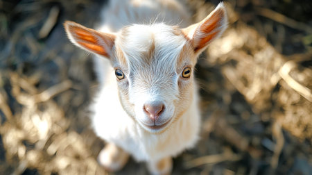 A playful baby goat looks up with wide eyes, showing its adorable features against a softly blurred backdrop.