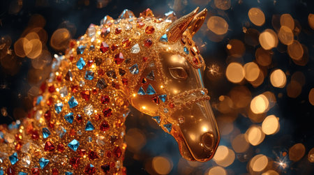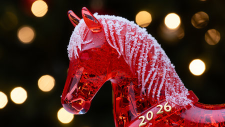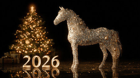 A shimmering horse sculpture made of intricate designs stands beside the year 2026, while a beautifully lit Christmas tree sparkles in the background, setting a joyful holiday scene.