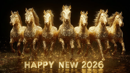 Majestic group of seven golden illuminated horses with flowing manes galloping forward with Happy New 2026 golden text below on dark background with golden sparkling particles.