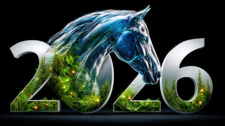 A surreal 3D depiction of 2026 with a transparent horse head and lush greenery within the numbers, set against a dark background