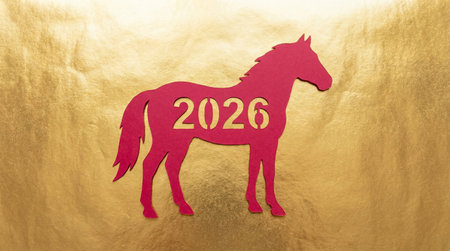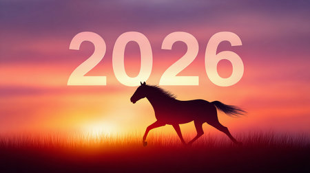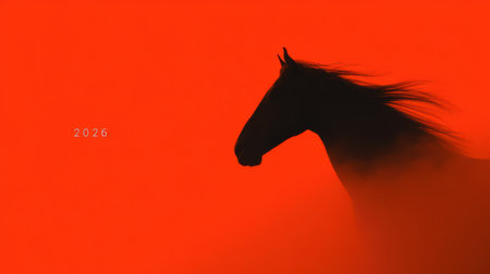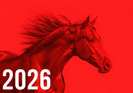 A striking silhouette of a horse in motion against a bold red backdrop, featuring the prominent year 2026.