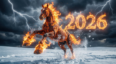 horse engulfed in flames stands on snow symbolizing the year 2026. Dark clouds loom overhead as lightning strikes creating a dramatic atmosphere for the scene.
