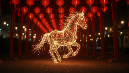 Golden wireframe horse galloping through Chinese red lanterns night – Year of the Horse magic