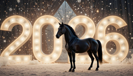 A horse adorned with holiday lights stands between glowing snow-covered 2026 numbers in a snowy outdoor winter setting symbolizing New Year..