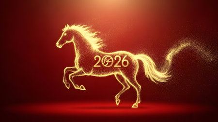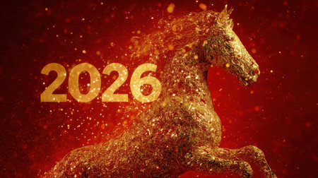 A red horse gallops through a shower of golden glitter with the year 2026 in the background. The scene conveys a sense of celebration and new beginnings.