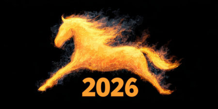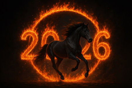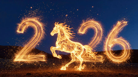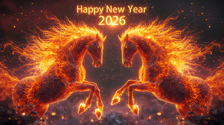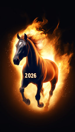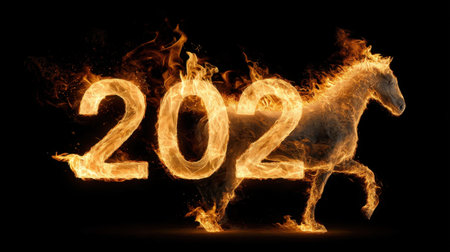 This striking image features a horse and numbers engulfed in flames, symbolizing the excitement of the New Year. It captures energy and celebration.