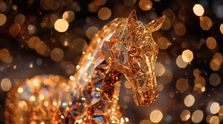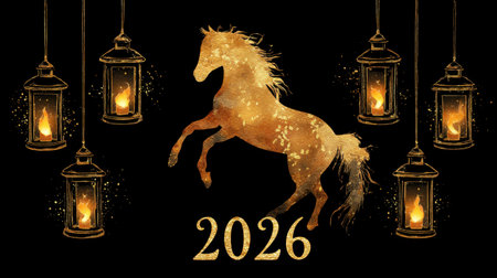 Stunning representation of a golden horse among glowing lanterns, symbolizing celebration and hope for the upcoming New Year 2026, suitable for various festive designs.