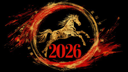 This artwork features a golden horse leaping within a circular design, complemented by the vibrant red number 2026, ideal for celebrations and cultural themes.