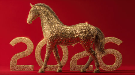 A stunning golden horse stands elegantly in front of the year 2026, capturing the essence of prosperity and celebration. This eye-catching piece symbolizes hope and new beginnings against a vibrant red backdrop.