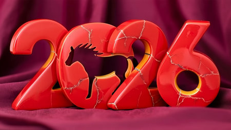 Majestic Fiery Horse with Stone Numbers 2026 on Crimson Background