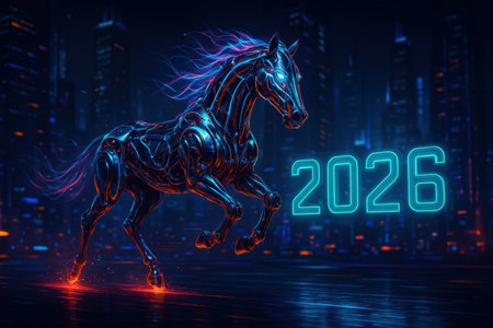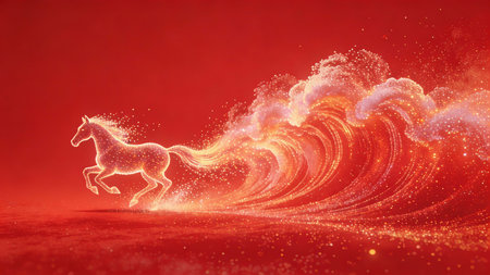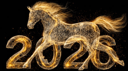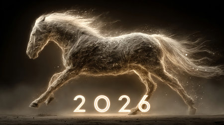 A stunning artistic representation of a horse made of light, symbolizing energy and prosperity for the year 2026.