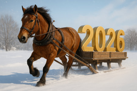 Realistic Horse and 2026 Sled in Bright Winter Scene. AI Generative.