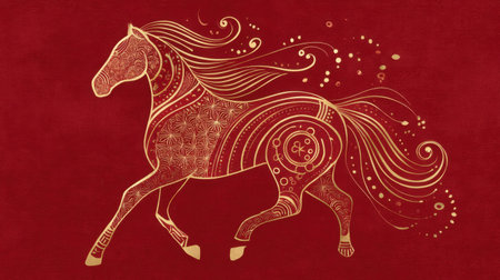 This stunning illustration features a golden horse with intricate patterns on a deep red background, embodying strength and elegance in a vibrant and artistic style.