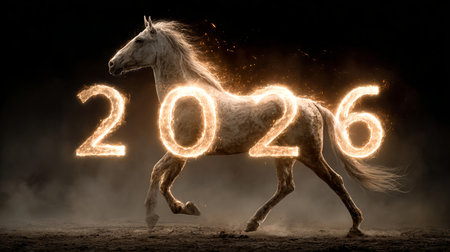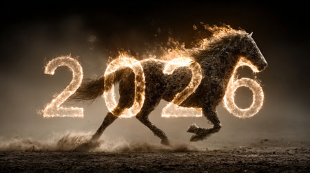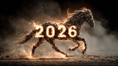 Fiery horse running with 2026 burning number on dark background, perfect for new year's eve celebrations