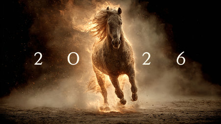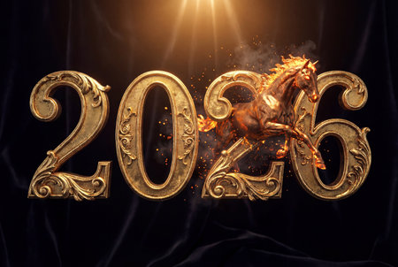 Ornate golden numbers forming '2026' with a fiery, leaping horse replacing the central '2', set against a dark draped background with a glowing light source. New Year 2026.