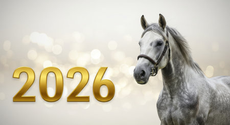 White horse and 2026 in gold. Chinese New Year or a general lucky equestrian New Year.