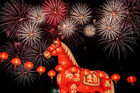 Chinese zodiac horse illuminated by glowing red lanterns, with fireworks exploding in the night sky above during the Chinese New Year celebrations.