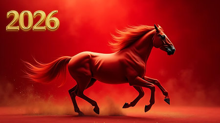 A striking golden horse symbolizes the Year 2026 against a vibrant red backdrop. Perfect for New Year celebrations, this artwork embodies joy and prosperity.