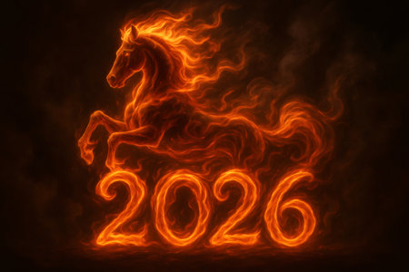 Fiery horse shape galloping over 2026 lettering made of fire against dark background representing Chinese new year