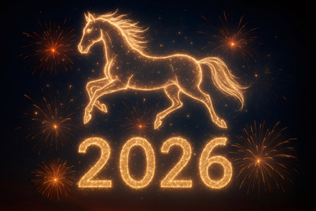 Horse silhouette galloping against a night sky, illuminated by vibrant fireworks celebrating the arrival of the new year 2026