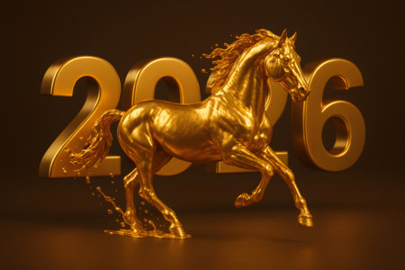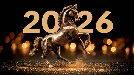 Golden horse statue running through the 2026 number celebrating the new year, against a brown background