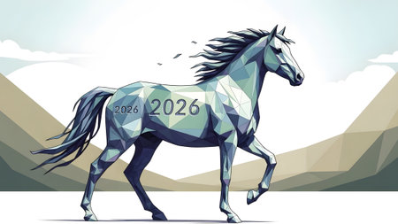 Geometric polygonal horse walking with 2026 numbers on a white background with abstract landscape.