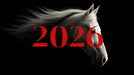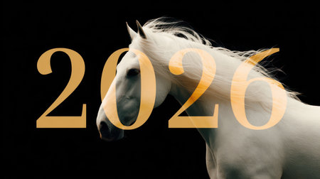 Majestic horse portrait with bold 2026 numbers on dramatic black background for Year of the Horse.