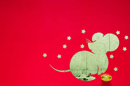 Chinese new year festival decoration on red background that cut in rat shape put on money gold packets . Character on ingot and gold money packet means “Blessingâ€.