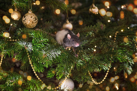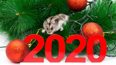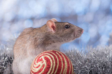 New year 2020. Symbol of the year of the rat. Rat sitting among the Christmas decorations.