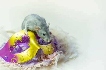 cute Dumbo rat sits on a carnival mask on a white isolated background. Decorative rat or mouse Chinese symbol of new year 2020 and Christmas. The concept of holiday, fun. Charming pet
