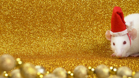 white rat in santa christmas cap on gold background. close-up. symbol of 2020. copy space.