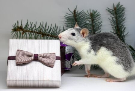 New Year concept. Cute white domestic rat in a New Year's decor. Symbol of the year 2020 is a rat. Gifts, toys, garlands, Christmas tree branches
