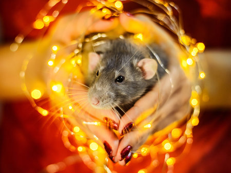 Symbol of coming 2020. Close-up of cute domestic rat sitting in festively decorated dark room with bright garlands.