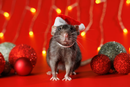 Colored rat on a red background. Mouse among Christmas balls. Pet in a Santa hat. Bokeh from blinking yellow lights of a festive garland. New Year concept.