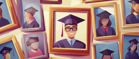 An old photo shows a man in a graduation cap and gown surrounded by various photos, creating a nostalgic collage, A nostalgic collage of photos from the graduate's academic journey