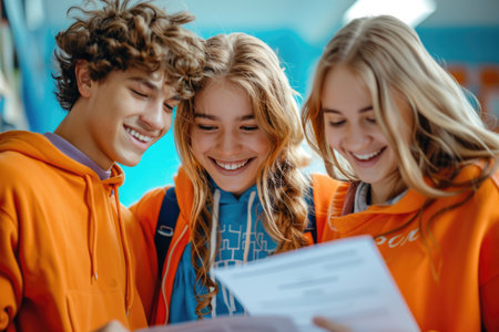group of 3 smiling teenage students wearing bright clothes looking at the documents standing in classroom. ai generated