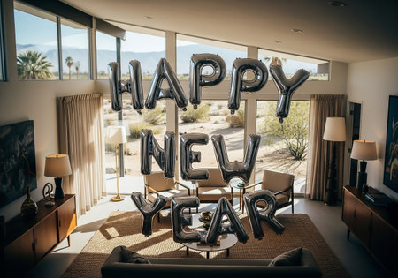 A modern living room decorated for a New Years celebration, featuring large black balloon letters spelling out Happy New Year amidst furniture and a scenic view.