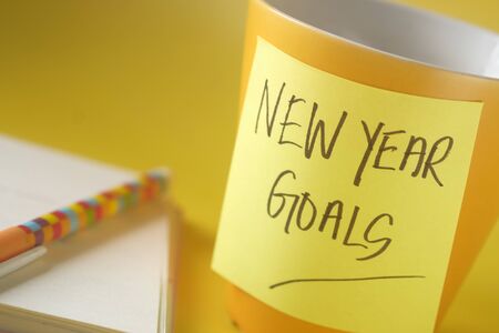 new year goals concept with tea cup an notepad