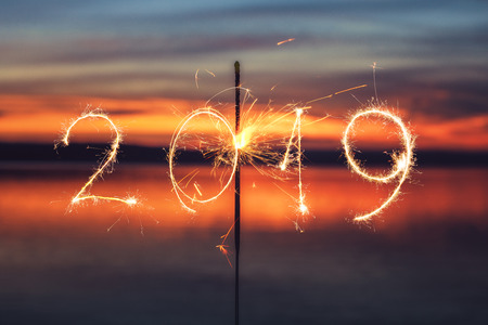 2019 written with Sparkle firework on sunset background, happy new year 2019 concept.