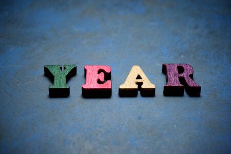 Year word on a blue table.