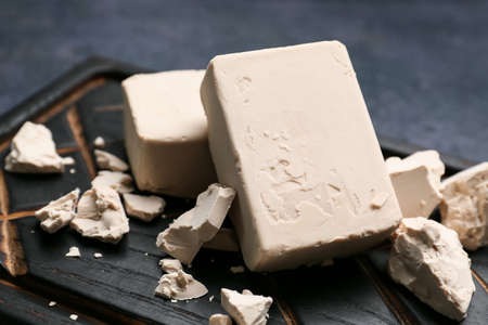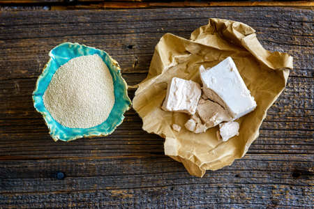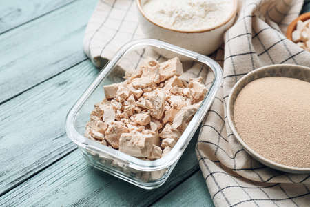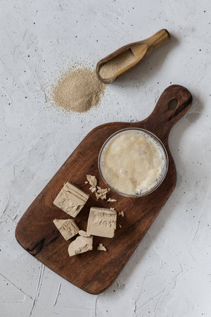 Different types yeast. Fresh pressed yeast, dry instant yeast and active wheat sourdough starter as wild yeast on wooden table. Low key. Selective focus. Copy space.