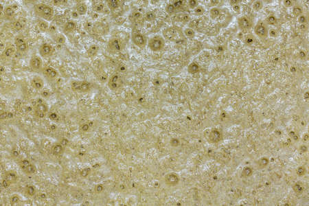A macro close-up of a kombucha SCOBY (Symbiotic Culture Of Bacteria and Yeast) during the fermentation process. The gelatinous, pale disc has large bubbles and an uneven texture. This image relates to brewing, probiotics, and healthy fermented drinks.