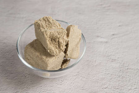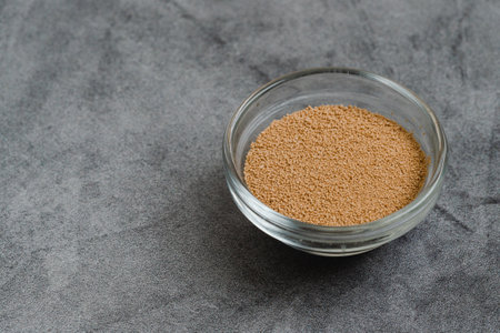 Dry yeast in a glass bowl close up on grey marble background, copy space