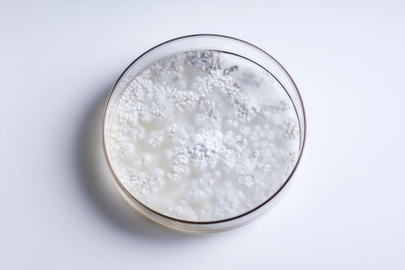 Petri dish showing intricate microbial growth under a microscope light, perfect for research or educational purposes, with copy space