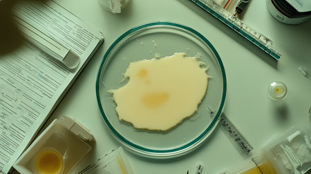A cream spot on a flat glass surface, with measuring tools and notebooks scattered across the lab table.