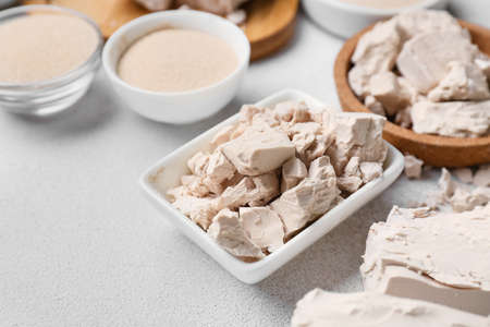Fresh pressed yeast and dry active yeast, such yeast is used for baking bread and cakes as well as for beer production Saccharomyces cerevisiae