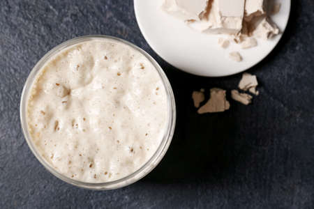 nutritional yeast in flakes and in active form. sour dough starter in a container. making bread at home. homemade dough starter. cooking and baking concept. top view