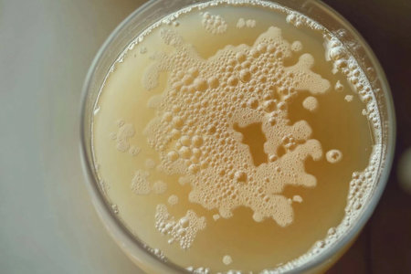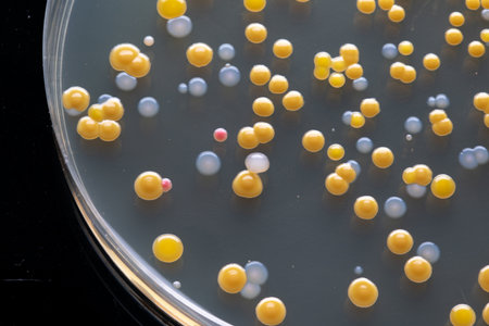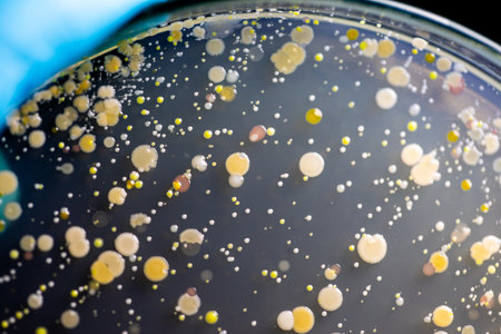 A petri dish filled with yellow agar culture illustrates various bacterial growth with numerous small white colonies, showcasing laboratory experimentation and microbial study.