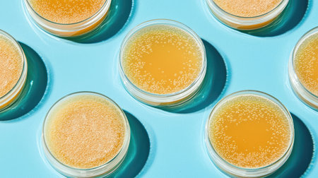 Close-up of skincare gel samples arranged in a Petri dish on a bold blue background.